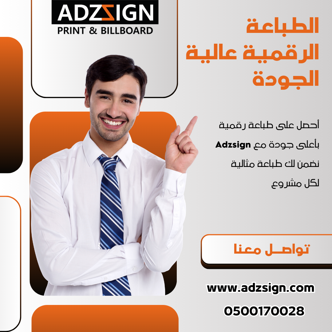 - جودة فائقة: نستخدم في Adzsign أحدث تقنيات الطباعة الرقمية لضمان الحصول على مطبوعات ذات جودة عالية، مع دقة ألوان وتفاصيل مذهلة.